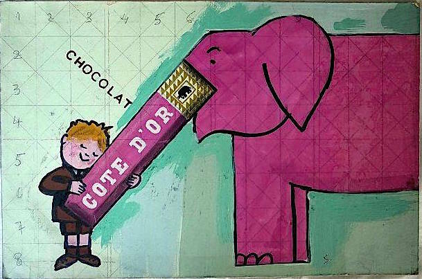 À l’origine, l’emblème de la marque était, selon le procès-verbal de dépôt, « un marin et un nègre tenant un drapeau portant l’inscription Chocolat de la Côte d’Or ». Le choix de l’éléphant à la trompe gourmand*, levée vers le ciel, fut inspiré par le timbre ghanéen apposé sur les sacs de fèves, pour symboliser « le goût puissant du vrai chocolat » ; il intervint en 1906. Cette image devait être légèrement modifiée au fil des années.