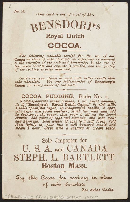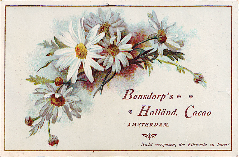 Trente-deux petits albums (10x 8,5 cm) composèrent un « Voyage autour du monde avec le Cacao Bensdorp » ; chacun d’eux comptait seize photographies en noir et blanc d’une grande ville (Berlin, Moscou, Copenhague, Séville, Bordeaux, Madrid, Athènes, etc.).