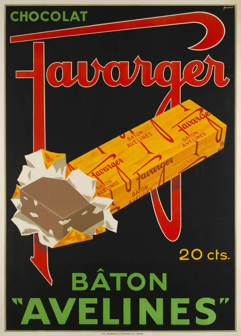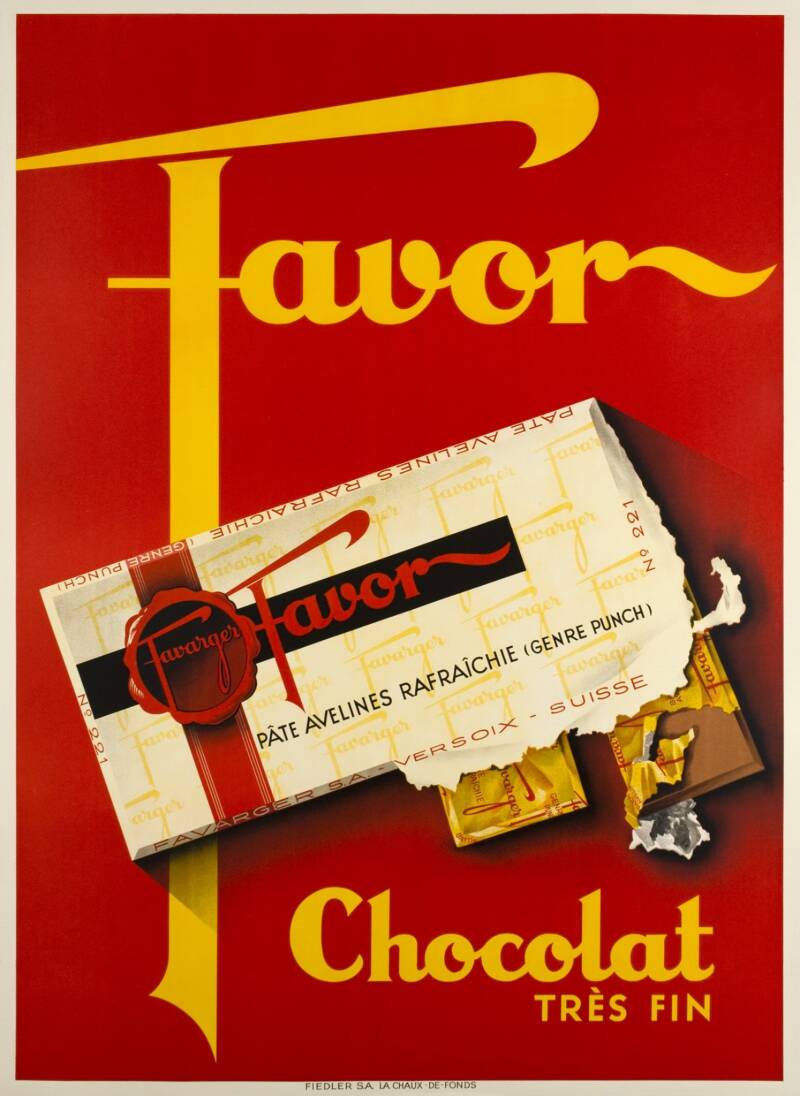 Une affiche en couleurs, de 1920, montre un enfant à skis, portant au bras un panier qui contient des produits de la chocolaterie. Sur une affiche photographiée, de 1930, un enfant souriant présente une tablette de chocolat. Par ailleurs, le « chocolat très fin », « pâte avelines rafraîchie (genre punch) », de marque Favor, produit par Favarger, a inspiré au graphiste suisse Jacomo Muller une élégante affiche (lith., vers 1935, 90 x 125 cm, Fiedler, La Chaux-de-Fonds) — sur fond rouge portant le texte en jaune, une tablette dont le papier déchiré dans un coin laisse voir le chocolat.