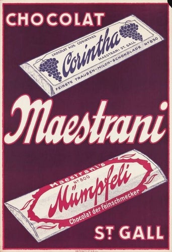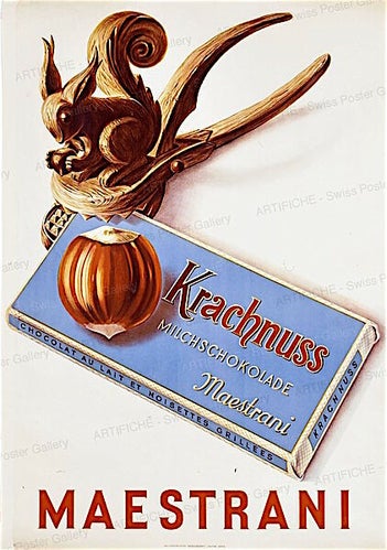 Une affiche lithographiée, conçue par Hermann Eidenbenz, vers 1945, figure un écureuil s’emparant d’une tablette, pour célébrer le chocolat au lait aux noisettes Maestrani Krachnuss (90 x 128 cm, Eidenbenz - Seitz, St-Gallen). Dans les années 1950, Paul Bender réalisa une affiche pour le Krachnuss Milchschokolade, « chocolat au lait et noisettes grillées » (93 x 129 cm, Paul Bender, Zollikon, Zürich). Le même chocolat inspira, à la même époque, à Celestino Piatti un écureuil découpé dans la tablette et tenant une noisette (90 x 128 cm, Wassermann, Bâle).
