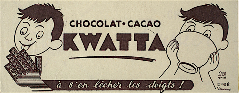 La publicité Kwatta est d’autant plus intéressante qu’elle arbore des signatures célèbres. Leonetto Cappiello réalisa une affiche pour le Chocolat Kwatta (1928, Devambez, Paris). André Wilquin conçut une publicité pour le Cacao Solubilisé Kwatta, confrontant, sur un fond « chocolat », une tasse moderne, d’un jaune éclatant, et une boîte à cacao ancienne dont le décor évoque de la faïence de Delft. Dans les années 1950, dans une composition privilégiant le rose et le rouge, « À s’en lécher les doigts », Hervé Morvan opta pour un garçonnet au regard gourmand, se léchant les doigts de la main, ceux-ci étant constitués de barres de chocolat. Cette image fut reprise sur des buvards, ici accompagnée de celle du même garçonnet buvant goulûment un bol de cacao, ou, là, accompagnée de celle du garçonnet plongeant un doigt dans le pot de Tartine. Il faut aussi mentionner la superbe affiche non signée du début du XXe siècle figurant, sur fond noir, un pierrot arborant une tenue jaune et un bonnet vert en train de boire une immense tasse de « cacao Kwatta ».