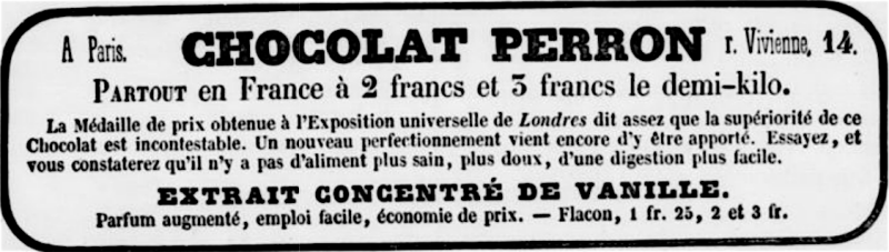 Chocolaterie créée en 1825 (1) par Eugène-Pierre Perron, établie au 3 rue des Amandiers-Popincourt, à Paris, et aujourd’hui disparue. Sans doute eut-elle très tôt un magasin au 14 rue Vivienne, car, dans les années 1830, une publicité concernait le « Chocolat de Perron ». Ainsi trouve-t-on un encart en 1835 (mardi 3 mars, n° 62) dans le journal L’Entracte : « Au cacao des îles, 2 f au caraque pur, 3 f. Leur douceur et leur pureté les distinguent de tous ceux connus. Rien n’est plus léger et plus suave que celui au caraque. Rue Vivienne, n° 9, au fond de la cour. »