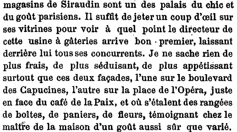 « M. Siraudin est le lion du moment, comme disent les Anglais. On ne parle que de lui, et l'on en parlera bien davantage encore dans trois semaines, à l'époque du jour de l'an. L'acte de haut et intelligent positivisme que vient d'accomplir cet homme de lettres, a été vite consacré par le succès. Un pèlerinage à son brillant magasin de la rue de Paix est aujourd'hui chose indispensable parmi la fashion ; — l'auteur du Bourreau des Crânes et de tant de comédies spirituellement bouffonnes, a transformé son public en clientèle ; jugez s'il est en train de faire fortune !