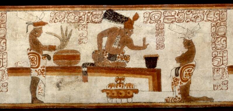 Vase maya (classique tardif) mis au jour à Peten. Un homme s'adresse à un serviteur agenouillé. L'assiette à offrandes tripode contient des tamales. Le bol à droite contient une boisson mousseuse, qui pourrait être faite à base de cacao