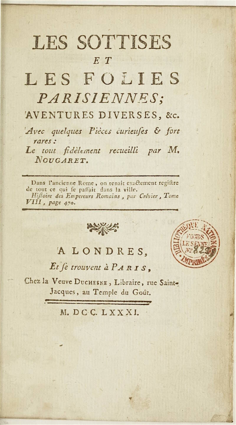* Les sottises et les folies parisiennes ; aventures diverses, &c. Avec quelques pièces curieuses & fort rares : Le tout fidèlement recueilli par M. Nougaret, Londres, Chez la Veuve Duchesne, 1781.