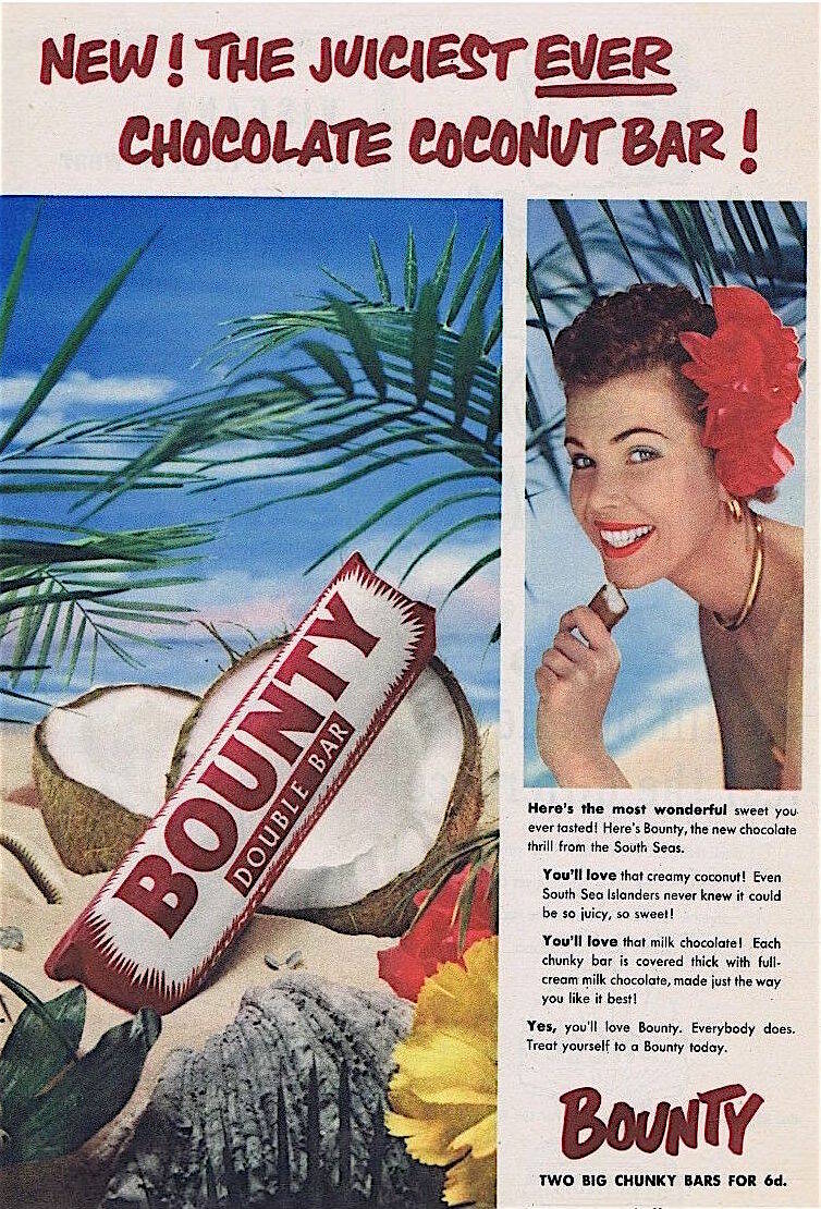 Bien que la société Mars fût américaine, les barres Bounty ne furent pas commercialisées aux États-Unis avant le milieu des années 1990. Lancé en 1960 dans le reste du monde et ainsi baptisé par la firme Mars en évocation de l’épisode des « révoltés du Bounty », cet article, enrobé de chocolat au lait ou de chocolat noir, est fourré d’une pâte compacte composée de noix de coco et d’un sirop du sucre vanillé. Il en existe en plusieurs versions.