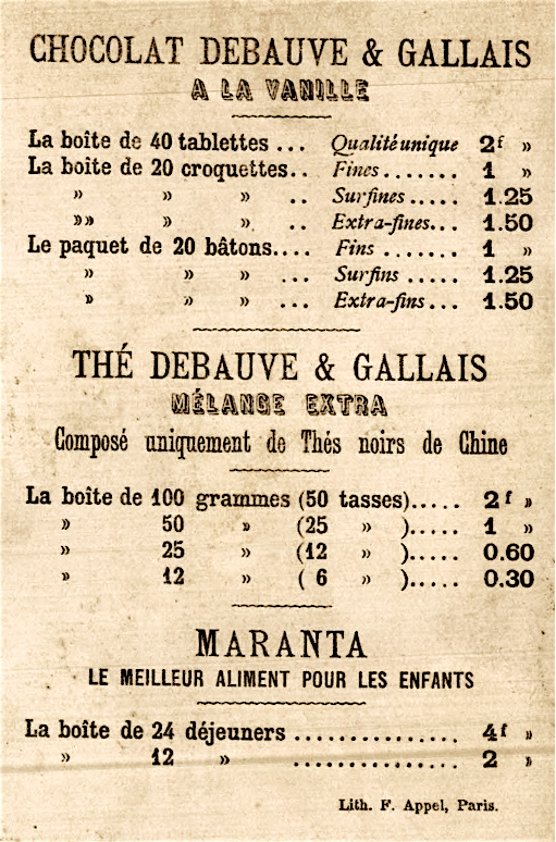 (5) Un catalogue de la firme, Tarifs et Propriétés des divers Chocolats de la Fabrique de MM. Debauve et Gallais (XIXe siècle) indiquait à propos du «chocolat adoucissant et antispasmodique au lait d’amandes et à la fleur d’orange» : « Lorsque des chagrins, des affections de l’âme ou quelque autre cause ont déterminé une extrême susceptibilité des nerfs, une alimentation qui réunit les propriétés tonique, adoucissante et antispasmodique, est une ressource inappréciable […]. »