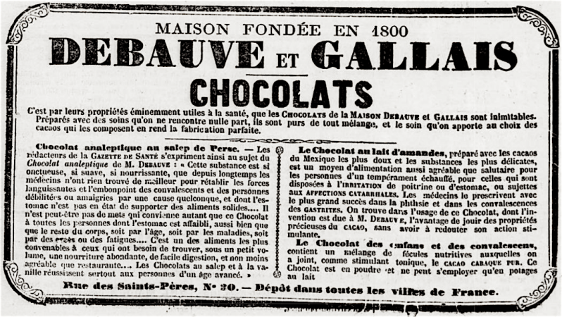 […] je ne saurais trop recommander à mes lectrices l’usage du chocolat au SALEP DE PERSE, de MM. Debauve-Gallais. Cette recommandation s’adresse surtout aux jeunes personnes et aux dames délicates qui sont sujettes aux maux d’estomac et chez lesquelles les fonctions digestives sont en mauvais état. Rétablir sa santé et conserver ses charmes, tout en déjeunant avec d’excellent chocolat, voilà un secret utile et précieux, dont une foule de personnes affaiblies ou valétudinaires ont éprouvé les heureux effets.