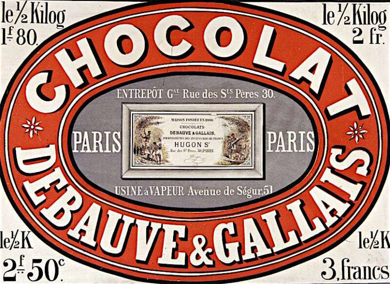 Quoi qu’il en fût, au fil de ces années, dans les coulisses de leur fabrique, les deux associés n’avaient cessé de poursuivre leurs studieuses recherches. En 1827 parut la Monographie du cacao, écrite par Antoine Gallais, qui innova en considérant le cacao sous un angle scientifique. En 1829, Debauve et Gallais firent construire la première machine destinée à remplacer l’ancien système du broyage à la pierre : une machine à cylindres en marbre blanc sur granit, et non pas en fer. En 1835, Gallais inventait la lactoline, procédé de déshydratation permettant de conserver les principes du lait. Passée dans les années 1840, après la mort d’Antoine Gallais, entre les mains de Zacharie Théry, beau-frère de Sulpice Debauve, et alors rebaptisée Debauve, Gallais et Théry, l’entreprise fut reprise en 1858 par Louis Hugon, époux de la fille d’Antoine Gallais. « Depuis Debauve qui faisait pour le comte de Chambord enfant ces monuments, ces artilleries, ces escadrons en chocolat exquis, les souvenirs ont conservé intacte cette belle renommée et aujourd’hui Hugon successeur de Debauve et Gallais maintient la maison au premier rang parmi les premières. », pouvait-on lire dans la Gazette de France (15 décembre 1860). Jusque là usine et magasins étaient réunis rue des Saint-Pères, mais cela ne suffisant plus, le nouveau propriétaire fit bâtir au 51 avenue de Ségur une usine modèle pourvue des derniers perfectionnements. Récompensée par une médaille de bronze à l’Exposition Universelle de 1867, la chocolaterie passa en 1873 aux mains de Gabriel Hugon, fils du précédent. Elle ne cessa de croître. À la fin des années 1880, sa production journalière s’élevait à 1 500 kilogrammes ; des aménagements envisageaient alors de la doubler.
