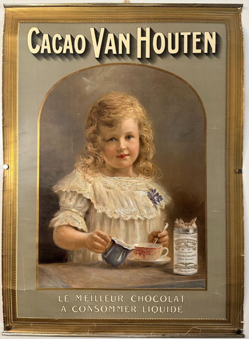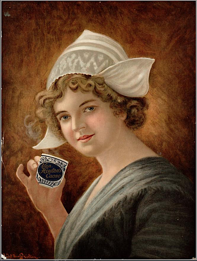 Empreinte de la grâce de la Belle Époque, une affiche de Privat-Livemont (Bruxelles, 1897) montre une femme humant le parfum d’une tasse du « meilleur chocolat à consommer liquide ». Tout comme, réalisée vers 1900 par C. Kiesel, une publicité se limite au portrait en pied d’une élégante, arborant robe crème et étole de fourrure, pour célébrer « Cacao Van Houten le meilleur chocolat à consommer liquide » (47 x 80 cm, sans imprimeur). En 1899, Johann Georg van Caspel imagina le « Van Houten’s Cacao en Chocolade » porté sur un plateau par une jeune fille vêtue à l’antique. Alors que Chilton prêta son talent à un portrait, sur un fond bleu sombre, de femme coiffée dans l’esprit du XVIIIe siècle, portant une tasse à ses lèvres. Avant la Grande Guerre, Harry opta pour un maître d’hôtel noir, à favoris, vêtu d’un costume rouge et d’un gilet blanc, portant tasse et boîte sur un plateau. Tandis qu’un jeune crieur de rues aux allures de gavroche,…